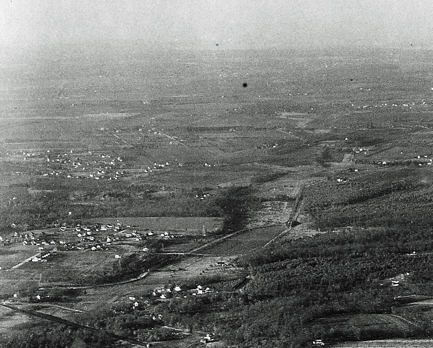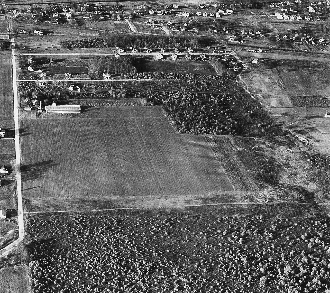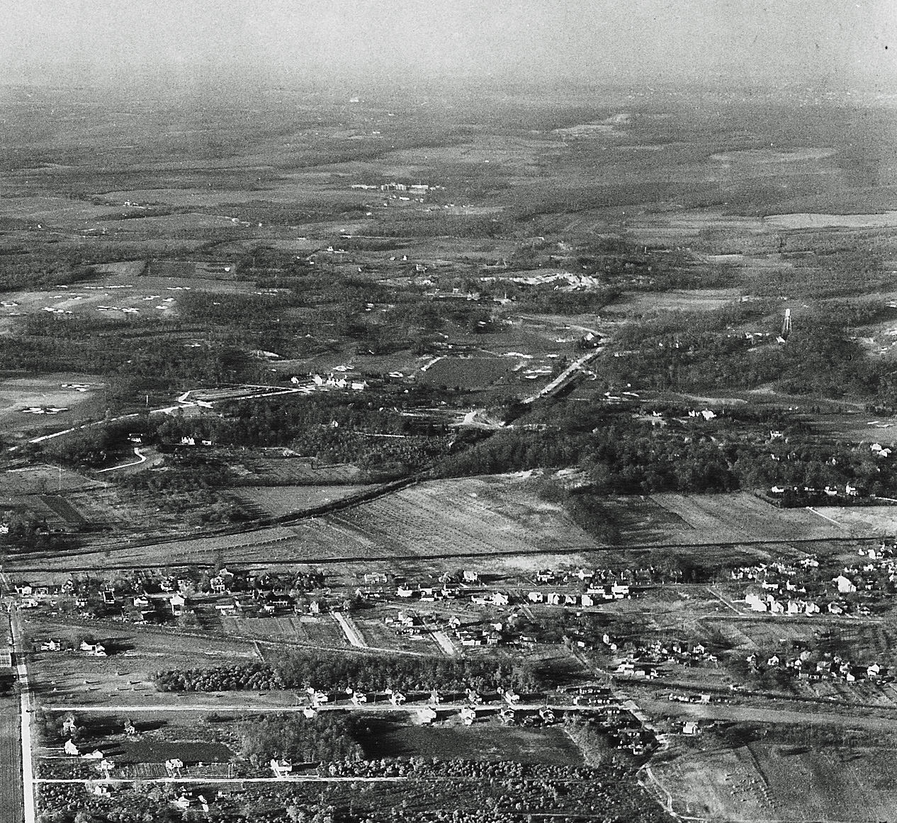 The railroad lines gave this one away. The location is Farmingdale, south of Bethpage State Park. The photographer is looking north. The parkway under construction (lower left corner) is the Bethpage State Parkway. In the picture can be seen Merritts Road (lower center), Fulton Street, Conklin Street, Fallwood Parkway, and Motor Avenue. Railroads are the Main Line and the Central Branch of the LIRR. The spur that went up to Alexander Stewart’s brickyard is still there, curving to the northeast. Thomas Powell Blvd. occupies the space of the old spur.