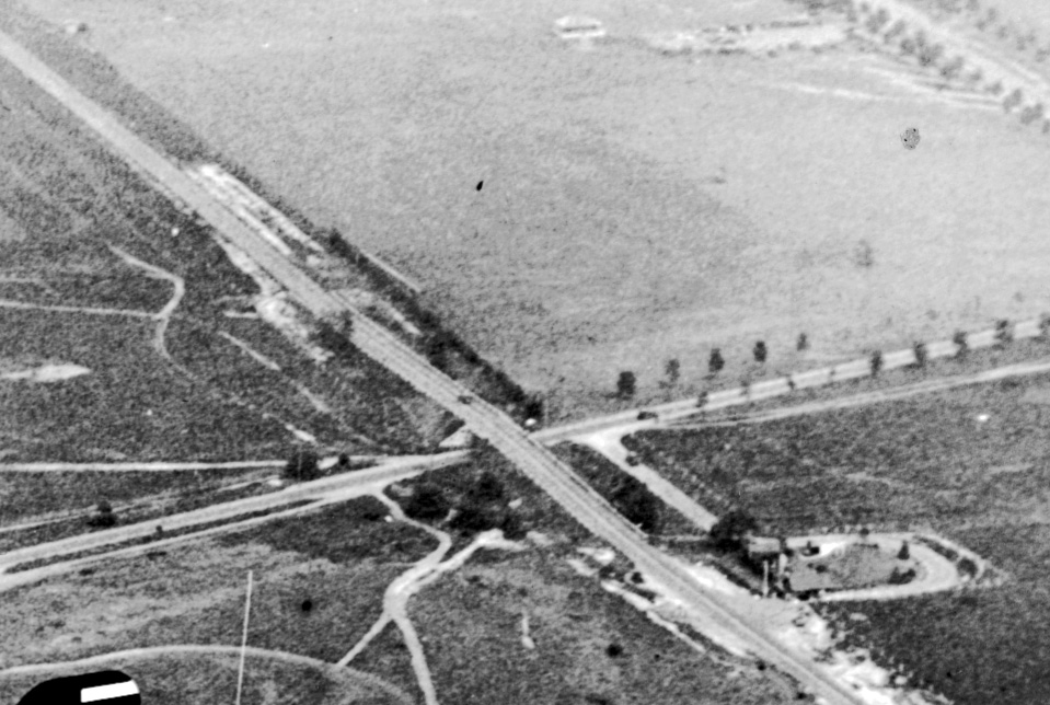 Looking east from Roosevelt Field with Merrick Avenue diagonally at the top and the Merrick Avenue Motor Parkway Bridge in the right corner.