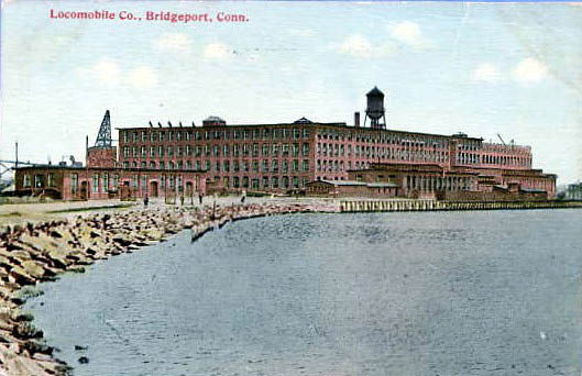 That looks like the Locomobile factory in Bridgeport, CT. I think that’s Joe Tracy driving the 1905 Locomobile racer in preparation for the 1905 Gordon Bennet Cup. Since the race was held on July 5, 1905 in France, the photo was probably taken some time in June of that year.