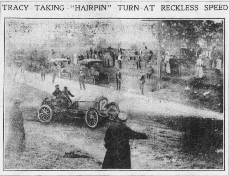 #12 Locomobile driven by Joe Tracy, Al Poole mechanician, 90 HP. Finished 1st. Joe Tracy encountered a setback when his Locomobile suffered a flat tire and had to stop at the Diamond tire depot near the hairpin turn in Old Westbury.