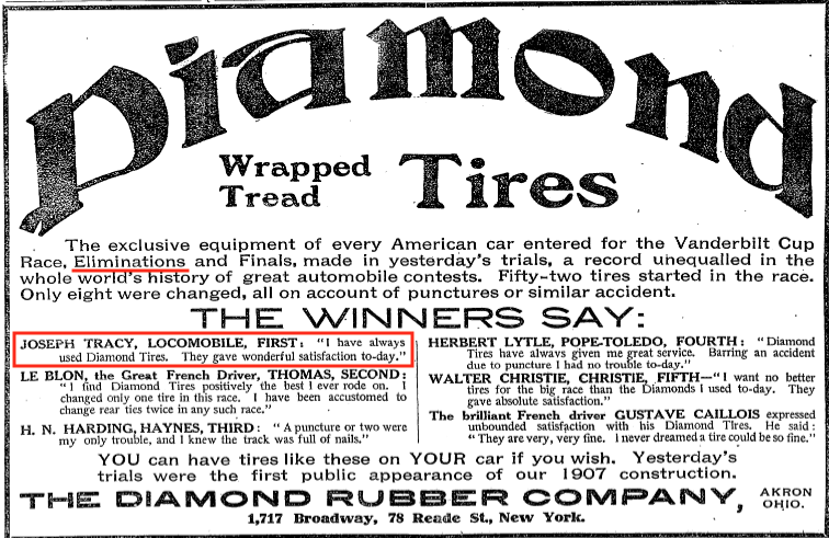 Looks like crowd-favorite Joe Tracy, in the Locomobile (mechanician Al Poole, captured as well), both winners of the Sept 22, 1906 Second American Elimination Trial Race (297 miles throughout Nassau County back roads), getting a flat fixed at the Diamond Tire depot near the hairpin curve in Old Westbury (still exists today!). If correct, sixteen year old Eddie Rickenbacker (eventual WWI ace fighter pilot) is competing as a mechanician with race-car driver Lee Frayer in one of the Frayer-Miller race cars. Locomobile headquarters in this race was near Bull’s Head Hotel in Greenvale (by today’s Northern Blvd, Rt 25A). This intense, well documented race caught my attention here.