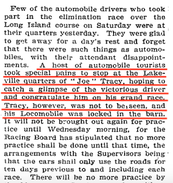 For the1905 and 1906 races, the Locomobile team from nearby Bridgeport, Connecticut set up their headquarters at Maple Cottage, a farmhouse located in Lakeville (now Lake Success).