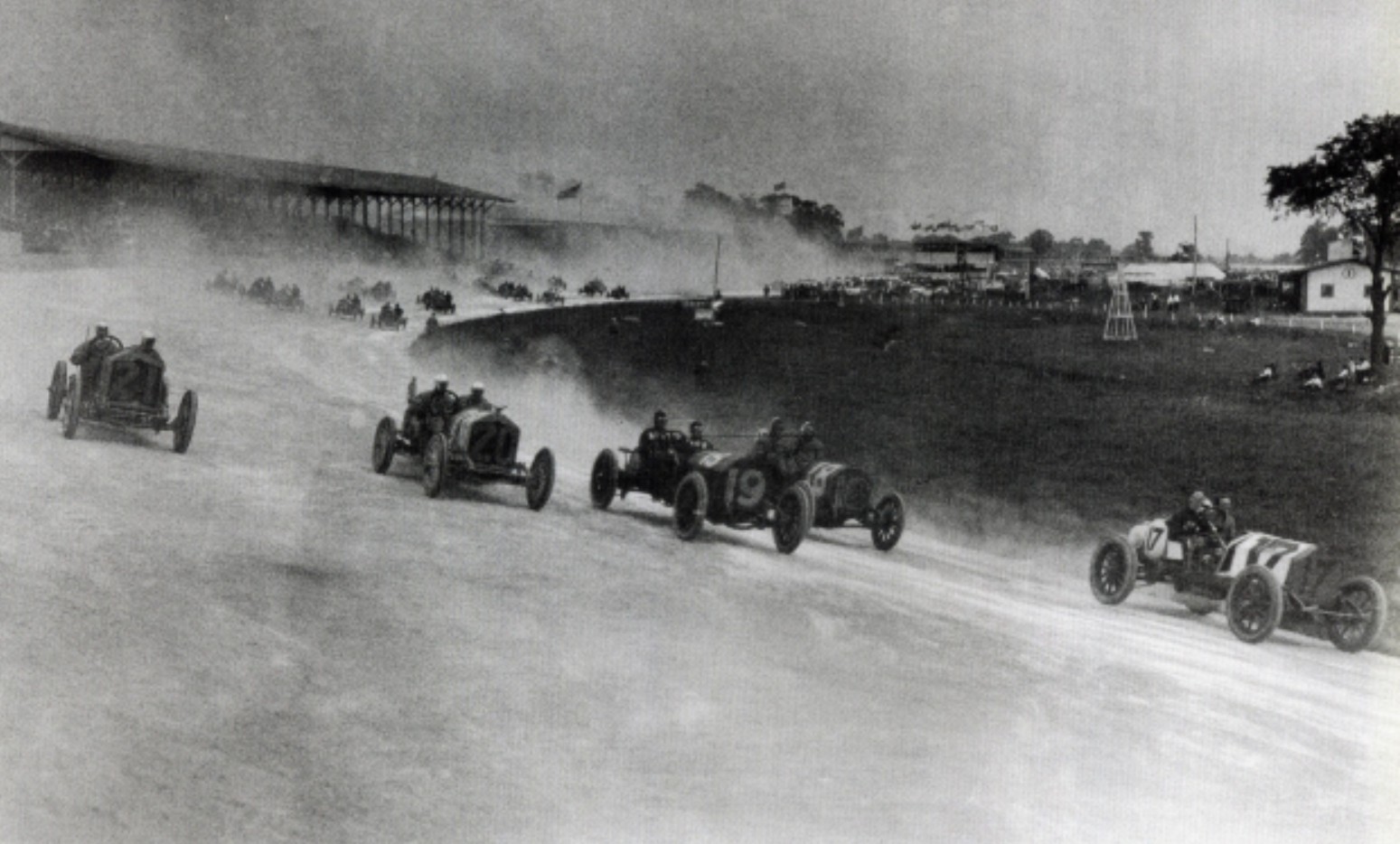 Indianapolis Motor Speedway. Tuesday May 30, 1911. First Indianapolis 500. Cars were started in order of entry. The numbers were assigned in order of entry. Each car must time at least 75 mph for a quarter mile flying start. The cars in the photo are in turn one on lap one of the Indy 500. #17 is Charles Basle driving a Buick. He finished 34th with mechanical issues. #18 is Eddie Hearne driving a Fiat. He finished 18th. #19 is Harry Grant driving a Alco. Grant finished 33rd with bearing problems. #20 is Charley Merz driving a National. Merz finished 7th. #20 is Howard Wilcox is driving a National. He finished 14th. Grant won the Vanderbilt Cup race 1909 and 1910. Grant drove a Lozier in the 1911 Vanderbilt race. He started first and finished 4th. Interesting to note that each car carried a 12 inch disc on the rear end of the car with the car number. The disc was colored. One color for cars 1-10, another color for cars 11-20 and so on.