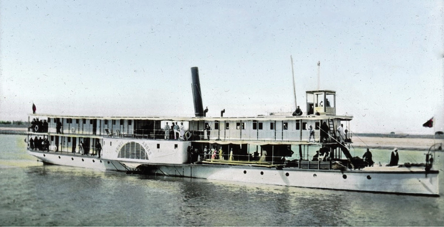 The Nile River has attracted tourists since the 1800s with cruises taking visitors to some of the greatest archaeological remains on the earth. Tourists in the 19th century were the driving force for the construction of paddle steamers. In 1869, Thomas Cook hired two paddlers for his tours of the Nile. Cook went on to build their own hotels and had a virtual monopoly over the tourist trade in the area. After 1885 they really began to expand their own fleet and in 1886, Cook commissioned Fairchild Shipbuilding & Engineering to build the 160x20 foot S/S Prince Abbas (shown here in 1900).
