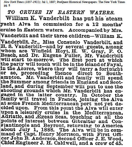 From left to right, (first row) Oliver Hazard Perry (O.H.P.) Belmont, F.O. Beach, and Alva Vanderbilt; (second row) William K. Vanderbilt (Willie K’s father), Consuelo Vanderbilt (Willie K’s 11-year old daughter), 10-year-old William K. Vanderbilt, Jr. and Dr. Francis Johnson; (third row) Miss Kulp, Captain Henry Morrison, an unnamed servant and Winfield Scott Hoyt (William K. Vanderbilt’s best friend.)