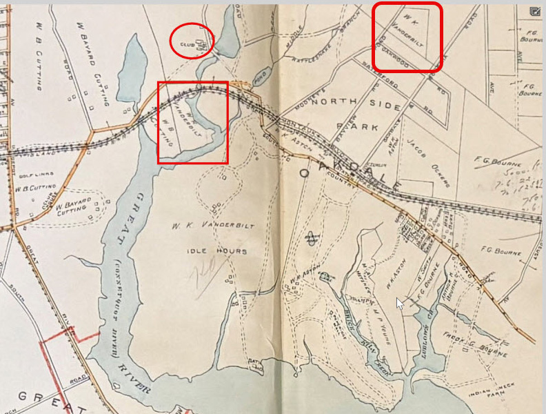 Howard, Good find on locating the properties owned by Vanderbilt in the vicinity. The sign now makes some sense. I would like to think that a bridge maybe just a footbridge, was built connecting the westerly parcel to Idle Hour.