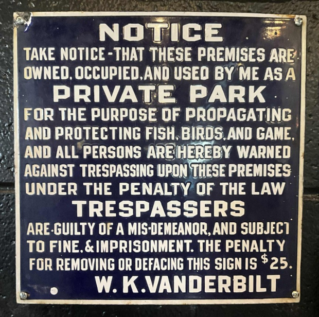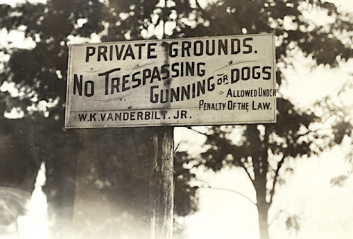 In almost all materials with his name, including this "No Trespassing" sign, Willie K. always tried to distinguish himself from his father and later his son by using William K. (or W.K.) Vanderbilt Jr, or William K. Vanderbilt II (after his father died in 1920).
