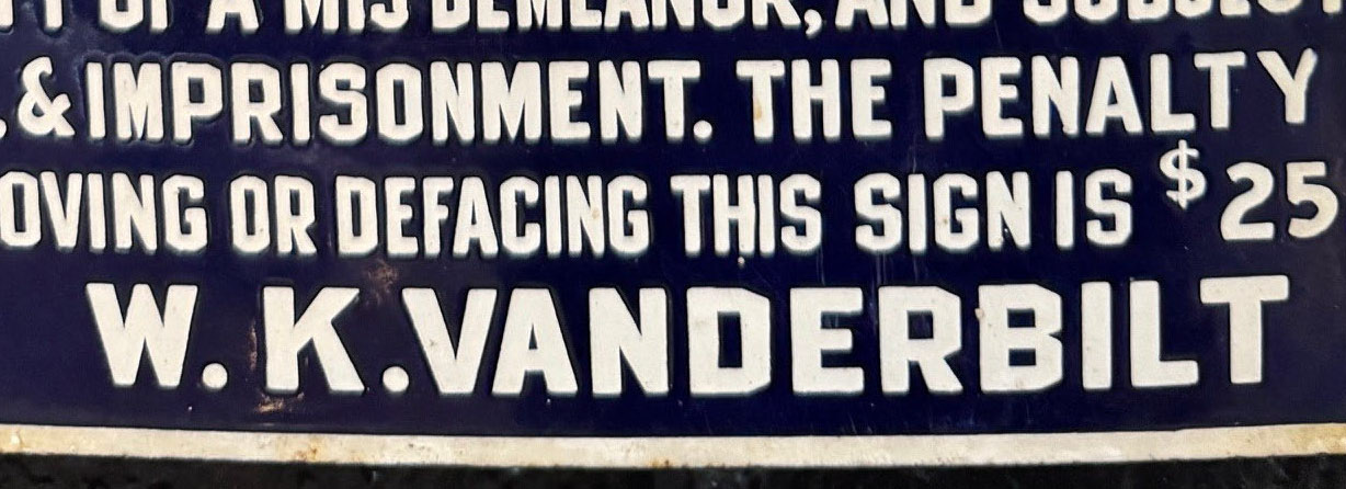 This recently acquired sign has clues, but we are unsure of where it is from, or which Vanderbilt owned it.