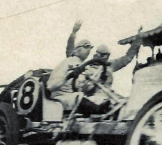 That photo was taken at the end of the 1911 Vanderbilt Cup Race in Savannah, GA on November 27, 1911. That’s Ralph Mulford driving the #8 Lozier Racer with Billy Chandler as the mechanician waving his arms. Mulford, also known as the “Gumdrop Kid”, participated in three Vanderbilt Cup Races: 1910, 1911, and 1912. Mulford finished first in the 1911 race, thus the reason for Chandler waving to the crowd.