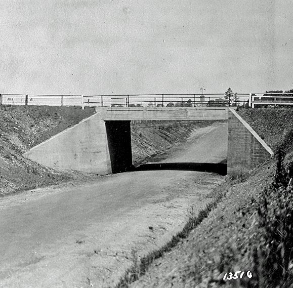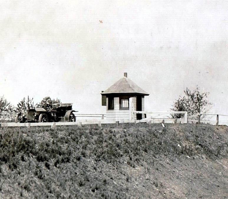 The uncropped version of the photo. As seen in this 1910 photo view of the Jericho Turnpike Motor Parkway Bridge looking north, the parkway indeed went under the bridge. The small kiosk on the left was the "Jericho Turnpike Lodge" from 1910 to 1921. Although it was called a "lodge", the kiosk was used only to collect tickets and did not have living quarters. The photo is courtesy of the Suffolk County Vanderbilt Museum.