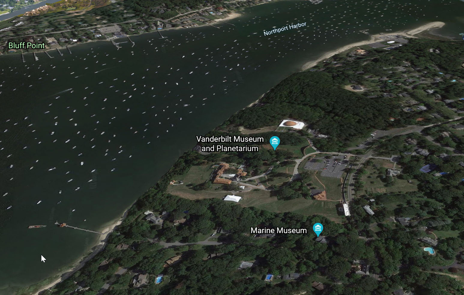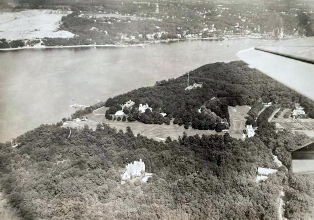 Over William K. Vanderbilt, Jr's Eagle's Nest Estate in Centerport looking southeast towards Northport Harbor. Note Vanderbilt's white Marine Museum.