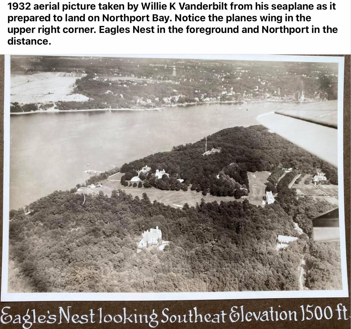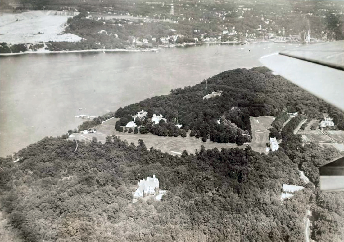 Looking east flying over Vanderbilt’s Centerport home (eagles nest) with Northport Harbor and the town of Northport in the upper right . Its Vanderbilt’s sea plane because he had a huge hanger on the Centerport side of the harbor.