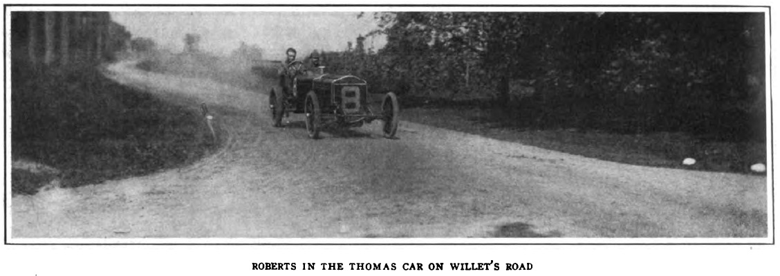 Sep. 23, 1905, Montague Roberts driving the 6-cylinder Thomas (double-triple) in the Vanderbilt qualification run. It showed well, but first one battery box broke, then the second, requiring the mechanician to brace the battery, and suffer acid burns. They had to slow down, and finished 5th. Normally that would have been good enough to qualify, but the committee made an arbitrary decision to not include the Thomas in the race. Roberts and E. R. Thomas were pretty annoyed.