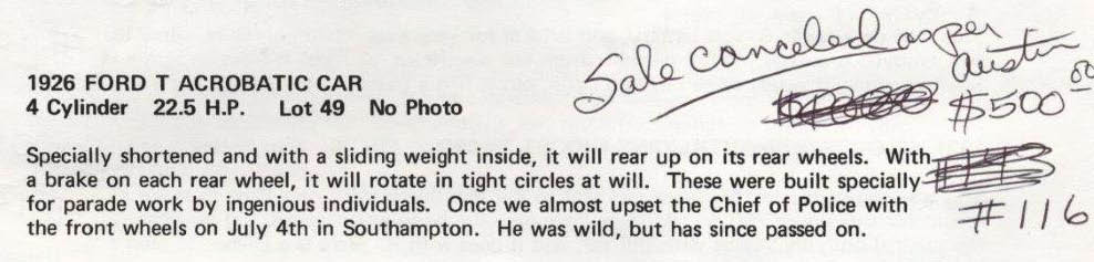 Walt Gosden: A 1926 Ford T Acrobatic car (Austin's description). It was sold at the auction of cars held at the Long Island Automotve Museum on October 13, 1979.
