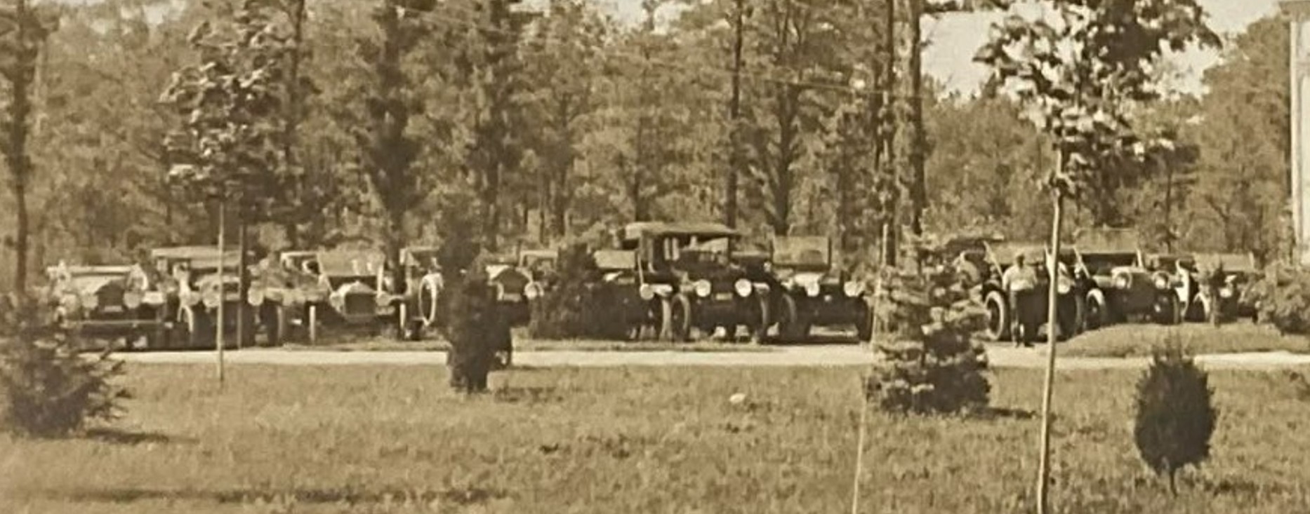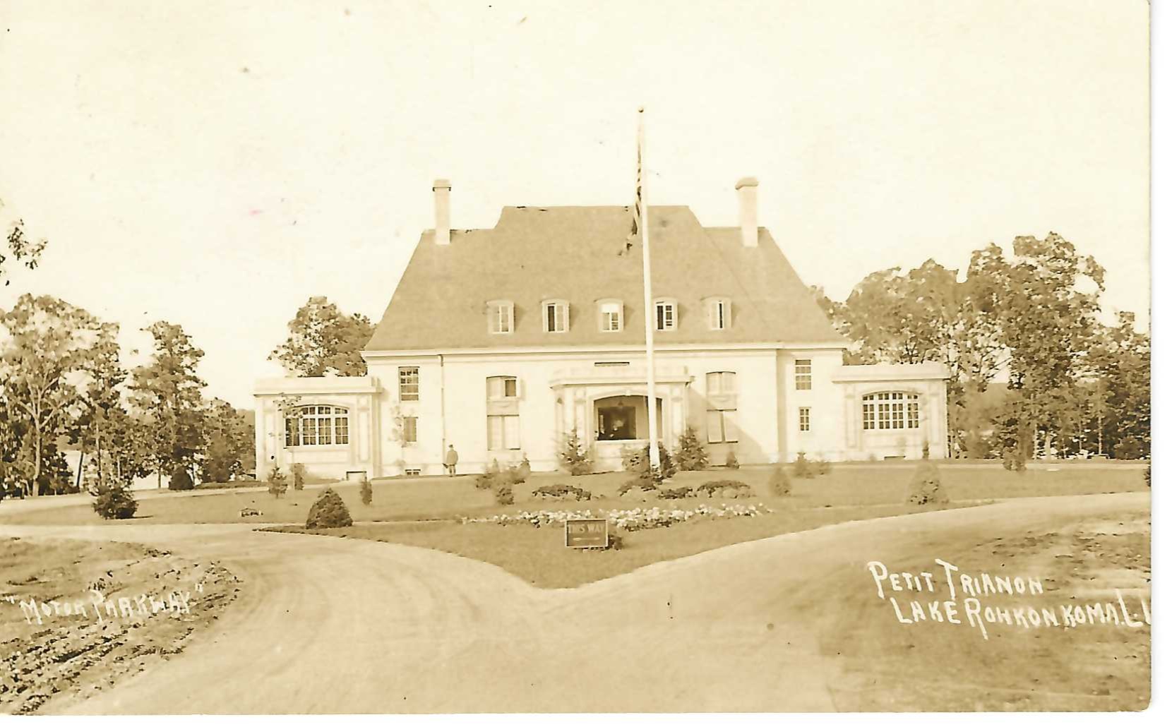 Partial capture of the former Petit Trianon (1911-1958) restaurant and lodging facility at the eastern end of the Long Island Motor Parkway at Lake Ronkonkoma. View is looking north towards North Drive (still there) where the vehicles are parked. Part of Petit’s traffic circle (now extinct) can be seen along the bottom of photo. A welcoming guesthouse that included outdoor swimming for weary motorists, some traveling the full 45-mile length of Motor Parkway from Queens County. Petit was designed by John Russell Pope who also designed the first 6 Motor Parkway toll houses (one remains intact today in Garden City at 7th St).
