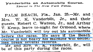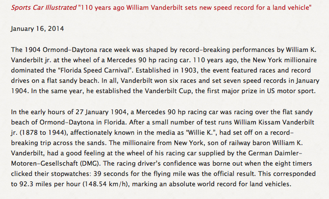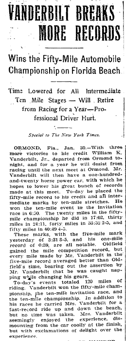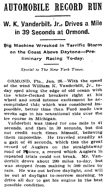 Adding to my previous answer: The actual event was Vanderbilt breaking the speed record of traveling one mile in 39 seconds on Jan. 27, 1904.