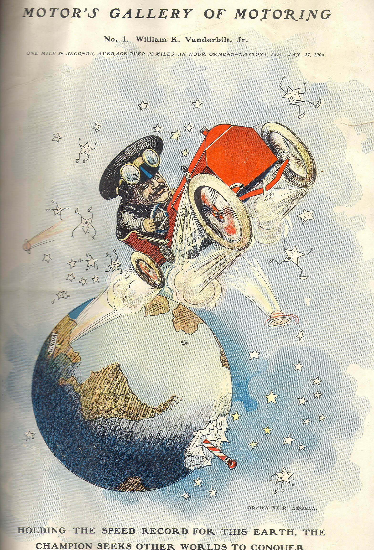 This is the cover illustration for an automobile trade journal “Motor’s Gallery Of Motoring”, that was published soon after William K. Vanderbilt, jr. set the land speed record of 92.30 MPH on January 27, 1904. It shows Willie K. in his Mercedes, the “Ormond Flier”, which he drove at Ormond / Daytona Beach, Florida, breaking Henry Ford’s recently established record. The caption under the illustration reads “Holding the speed record for this earth, the champion seeks other worlds to conquer”. This was quite prophetic since Willie K. went on to establish the Vanderbilt Cup Races later that same year.