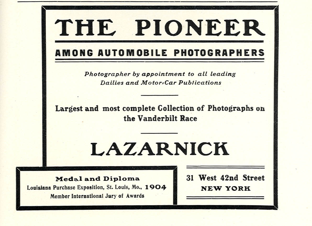 Nathan Lazarnick was a pioneer photographer of the development of early automobiles and racing from the early 1900s to the late 1920s. Born in Russia on September 7, 1879, Nathan Lazarnick was brought to the New York as an infant. His education included the study of art at Cooper Union in New York. At the turn of the century, he worked as a photographer's apprentice for three years. He then became a free-lance photographer for the New York Mail, the New York Herald and Harper's Weekly and all the major automobile trade journals. In this capacity, he covered many automotive events including the Vanderbilt Cup Races, the presidential campaigns of Taft, McKinley and Roosevelt. Among the people he photographed were Steinmetz, Edison, Oldfield, Rickenbacker and many prominent personalities of the era.