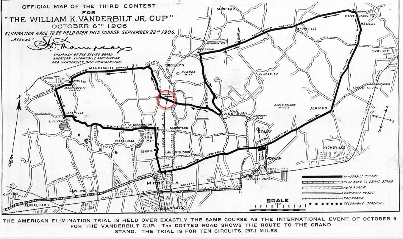 You can see that the postcard image was captured further west/at Mineola Ave than the 1906 photo race photo. Remember the question of the train being so far from the main line and bridge? Nassau Power & Light utilized a RR siding, this also allowed for spectators to arrive by rail; good plan.