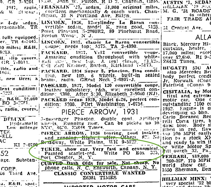 Rocco advertised it for sale in the October 19, 1952 edition of The New York Times. “Tuker (sic), show car, Very fast and economical,” he assured. The car failed to sell, however, and remained in Mr. Rocco’s ownership for the rest of his life until the late 1960s.