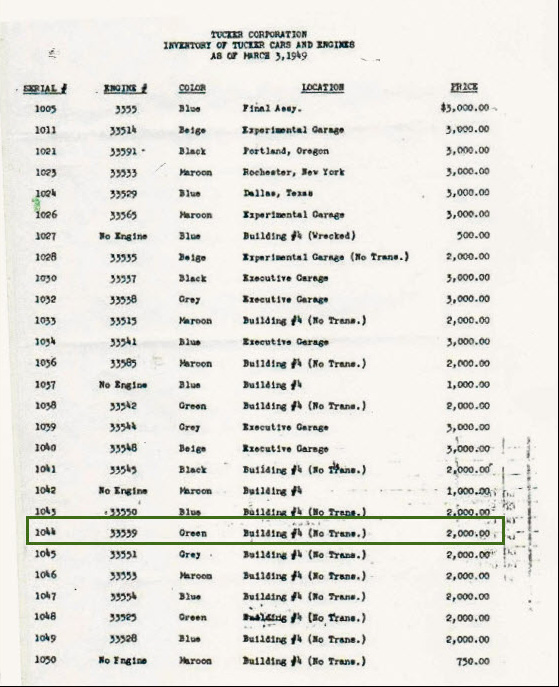 The Andante Green Tucker 1044 is listed on the March 3, 1949 Tucker Inventory to be sold for $2,000. It was stored in Building #4.