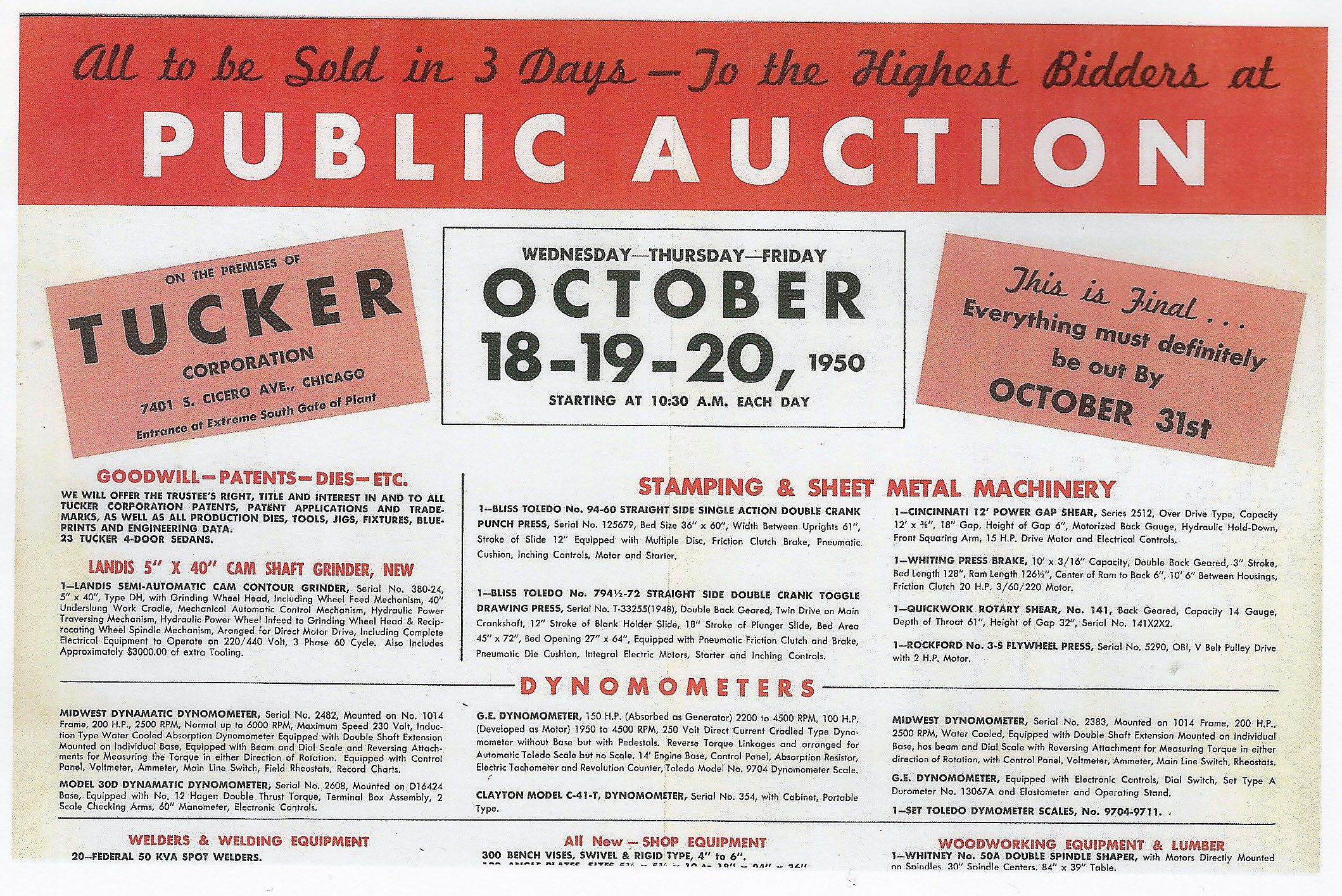 At the famed auction of the Tucker Corporation’s assets at the Tucker Factory in Chicago on October 18-20, 1950, Tucker 1044 and the Tucker Tin Goose prototype were sold to Rifken, proprietor of S&S Auto Parts in Schaumburg, Illinois.