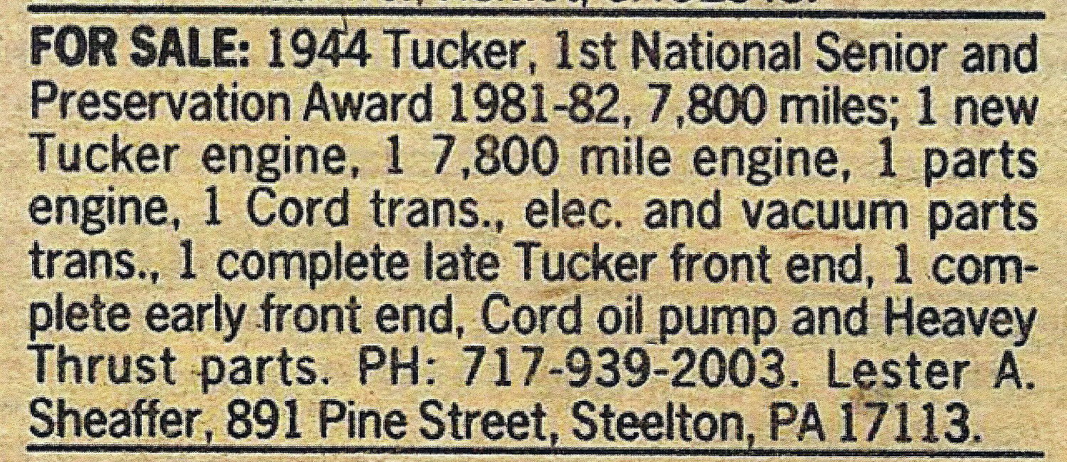 In the November 4, 1982 issue of Old Cars Weekly, Sheaffer offered the Tucker 1944 (sic) for sale. Mileage: 7,800.
