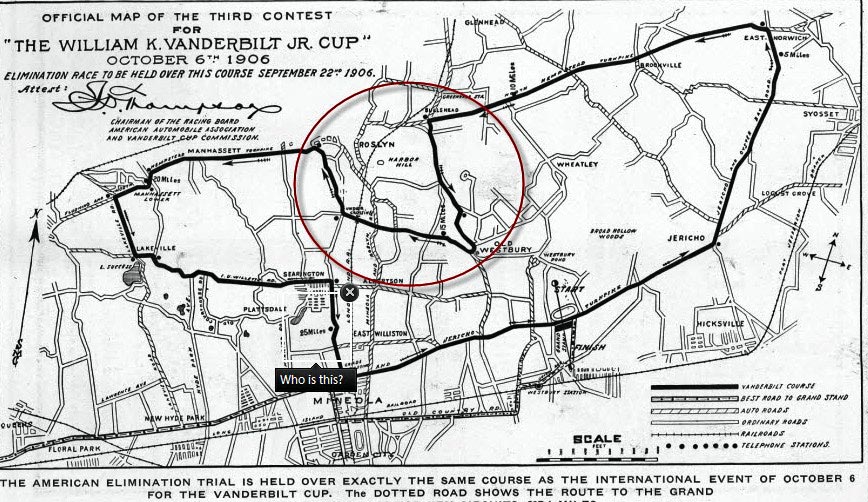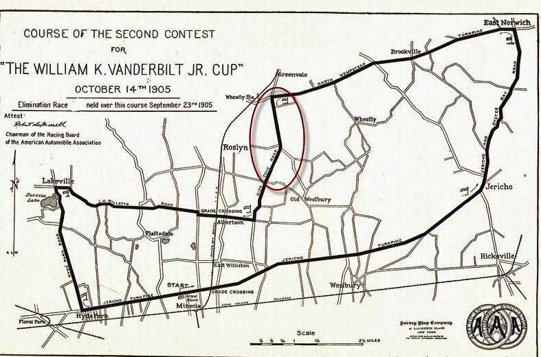 The 1906 course also included Bull Head Turn and a part of Glen Cove Road. The course turned east at Red Ground Road heading towards Old Westbury. After making the Hairpin Turn at Wheatley Road, the course went on to Old Westbury Road (now the nort service road of the Long Island Expressway) and headed north on Mineola Avenue.