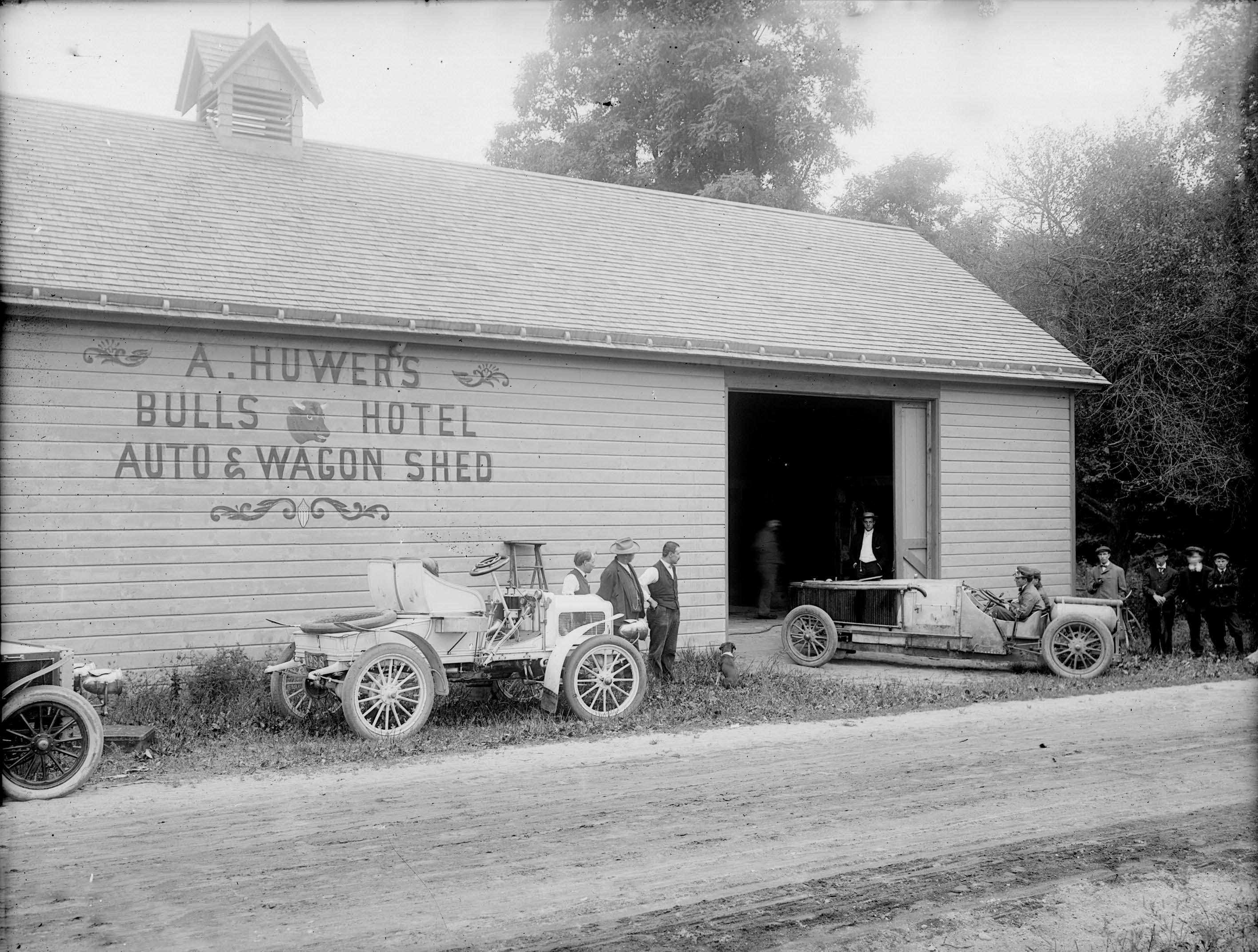 The headquarters for the only non-gasoline racer to participate in the Vanderbilt Cup Races was the Bulls Head Hotel "Auto & Wagon Shed".