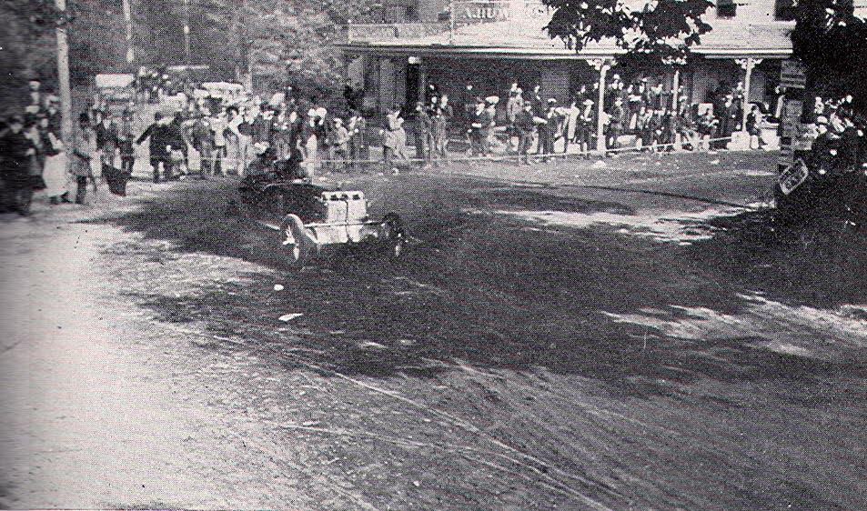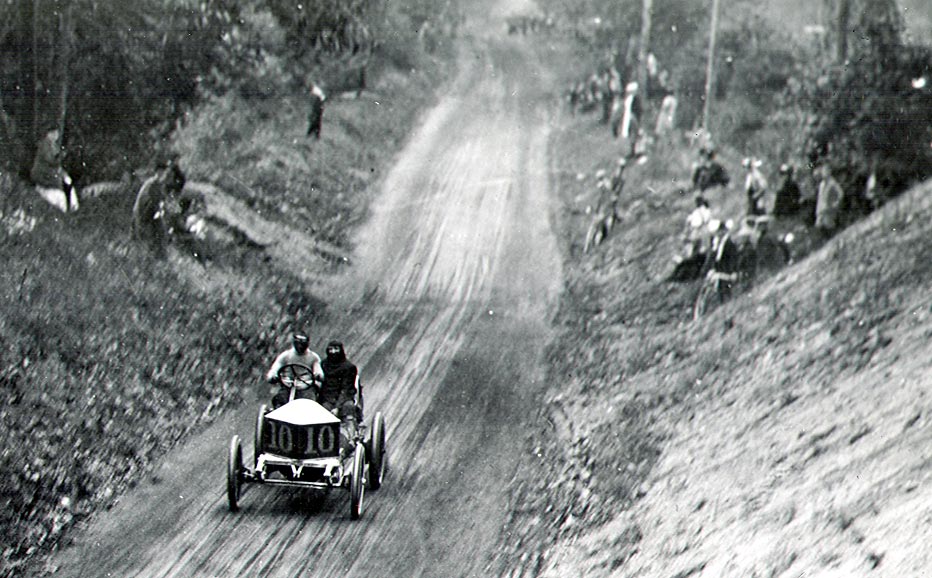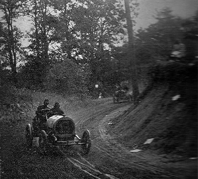 Walter Christie driving his unique front-wheel drive Christie racer at Bulls Head Turn.
