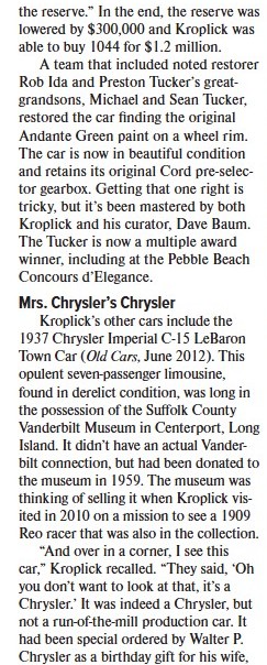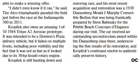 This upcoming article on page 22-24 by Jim Motavalli features all the current cars in the Kroplick collection with the exception of the 1930 Duesenberg Model J Sedan Convertible Berline which at the time was engaged in a mechanical restoration for Pebble Beach by Steve Babinski's Auto restorations in Lebanon, N.J.