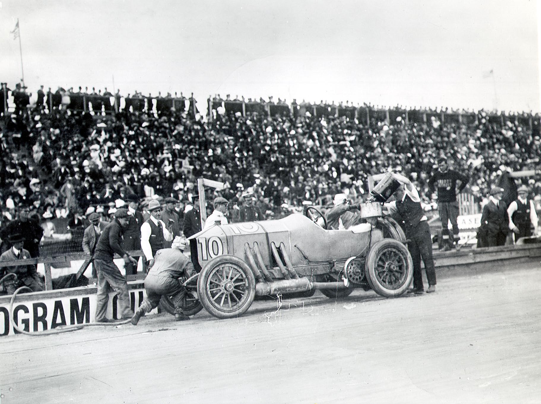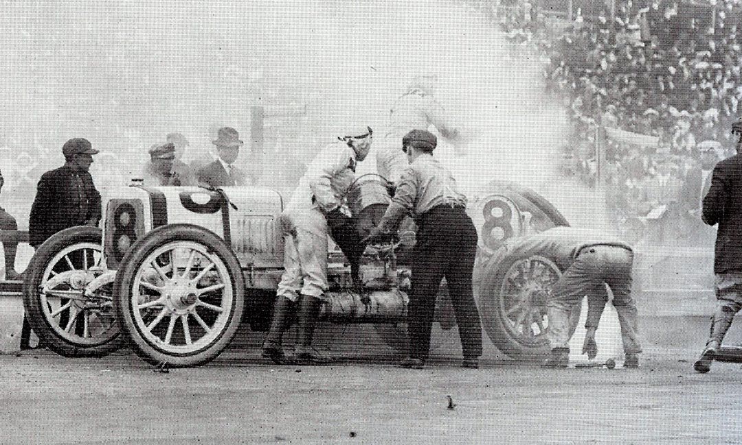 DePalma continued to run the quickest laps, but had to come in for tires again. On lap 11, Wishart lost nine minutes changing a tire, while Smilin’ Ralph Mulford continued clicking off laps in thirteen minutes. With 4 left, and a five minute lead, Mulford finally stopped for tires, gas and water. The crew was practiced and returned the Lozier to the lead in 1:06.
