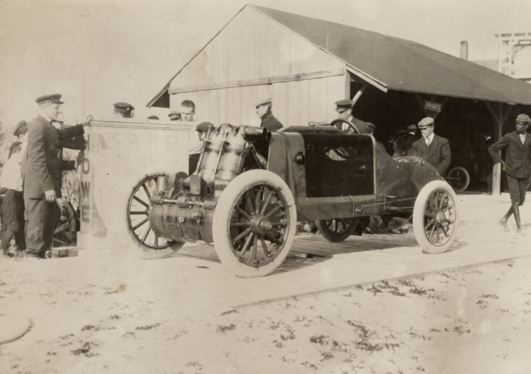 Here at left can be seen Walter Christie's front-wheel drive racecar being weighed on a Howe scale during the 1908 Ormond-Daytona races in Florida.