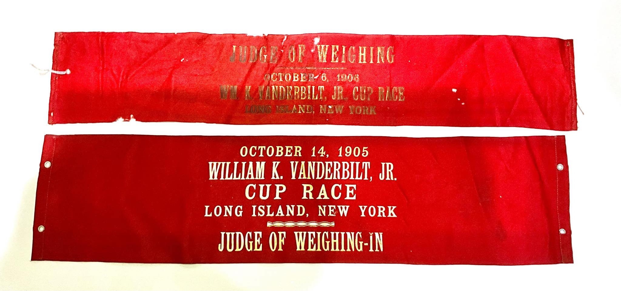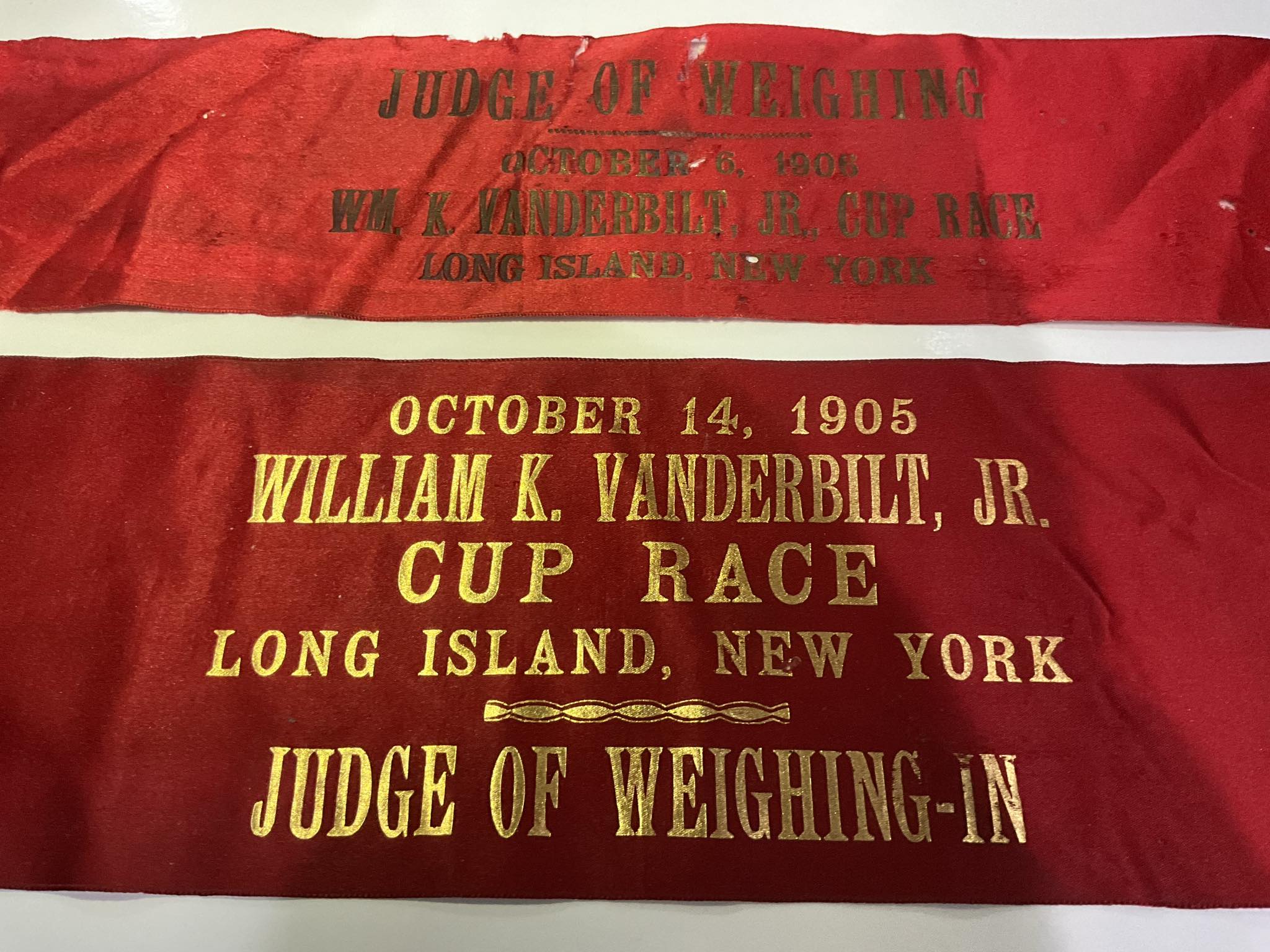 These two rare silk armbands were worn by the judges of the weighing-in for the 1905 Vanderbilt Cup Race and the 1906 Vanderbilt Cup race and are in amazing condition for being 119/118 years old and delicate.