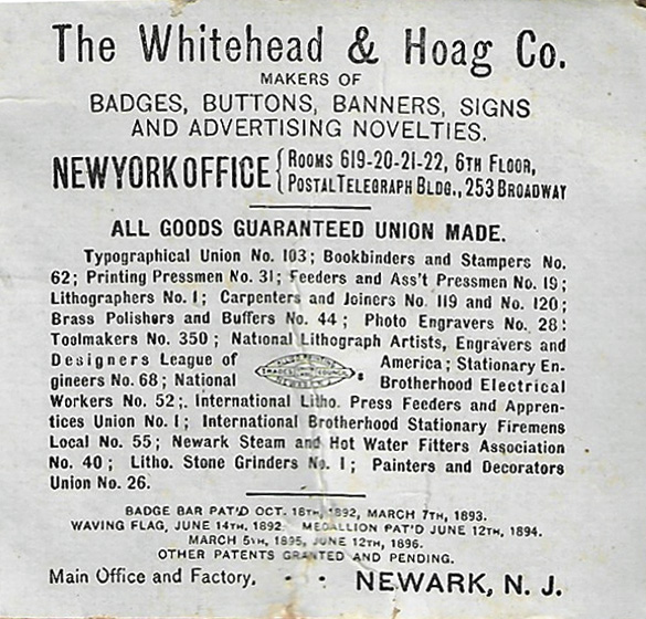 As stated in the previous Contestant ribbon post, The Whitehead and Hoag Company was the preeminent American manufacturer of advertising novelties. The company was founded in 1892 by Chester R. Hoag and Benjamin S. Whitehead. Initially, the company was known for the creation and manufacture of ribbon badges such as this contestant badge.