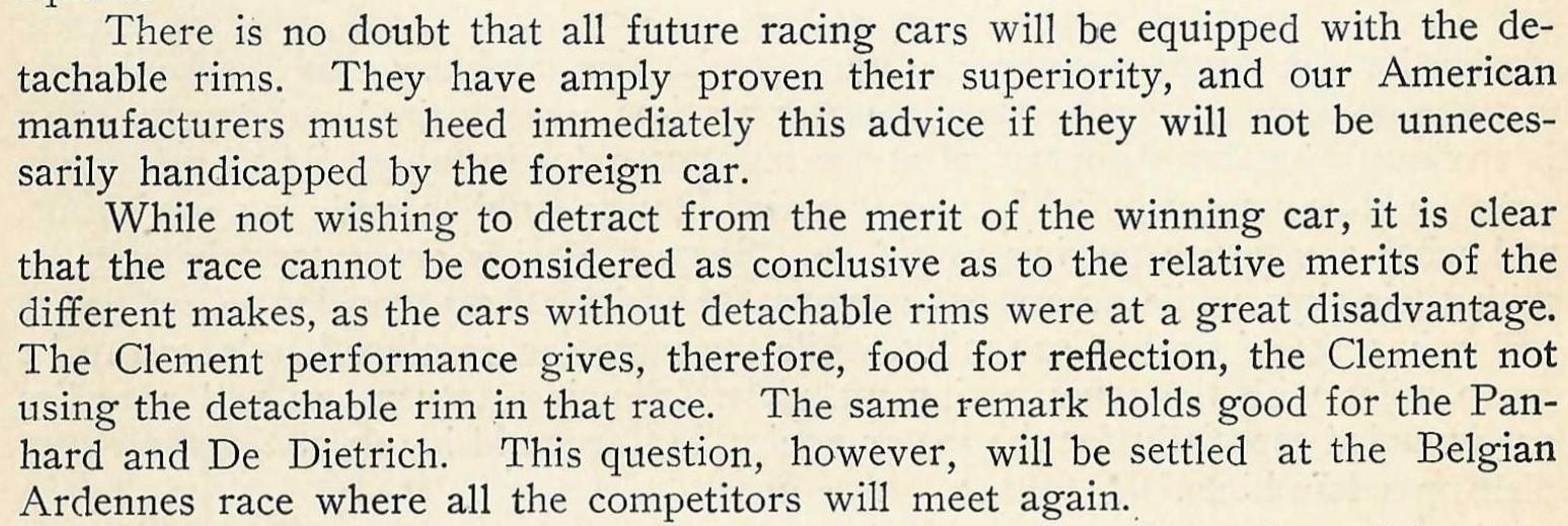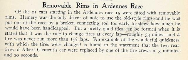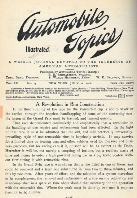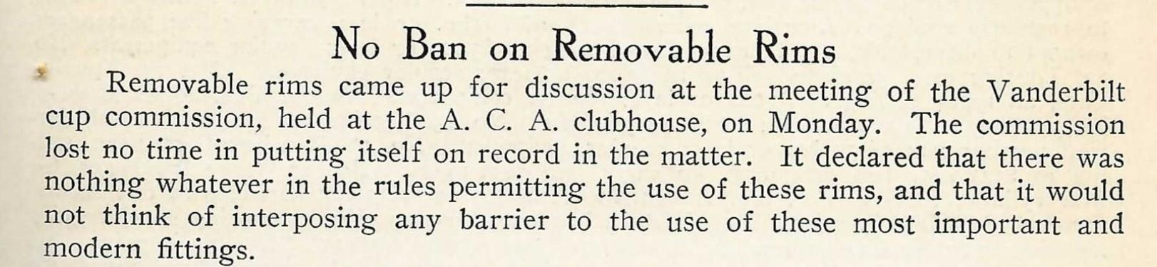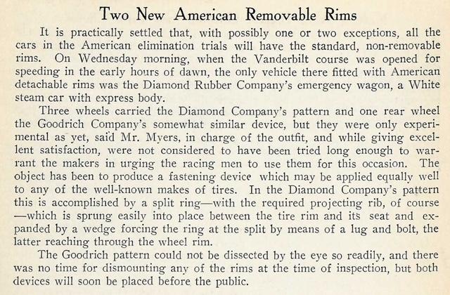 Initially, as mentioned many times during the 1906 season, it was thought that the removable rim was an unfair advantage and not be allowed. But the Vanderbilt cup commission convened and were quick to state there was nothing in the rules to prevent them, and they were an "...important and modern fitting."