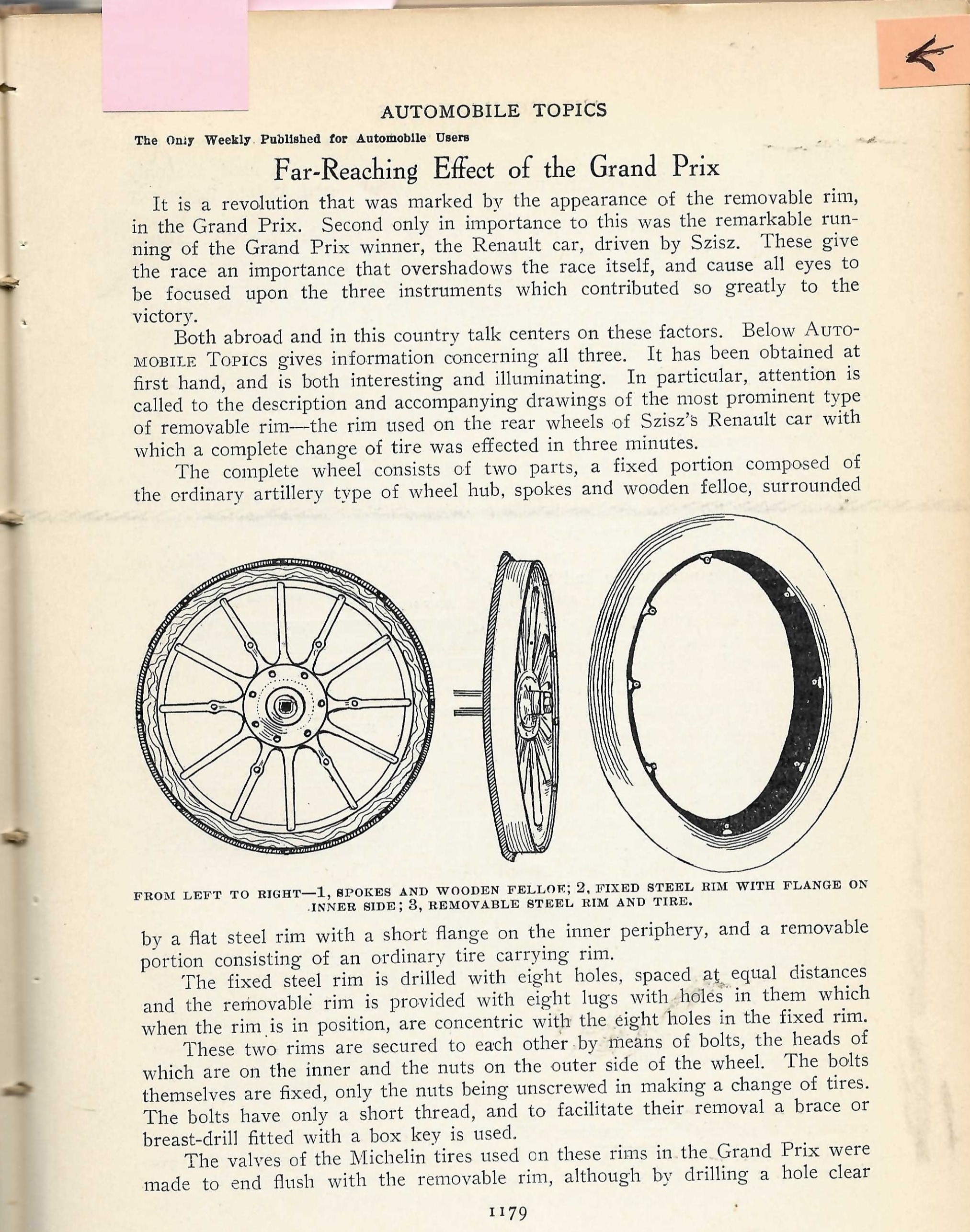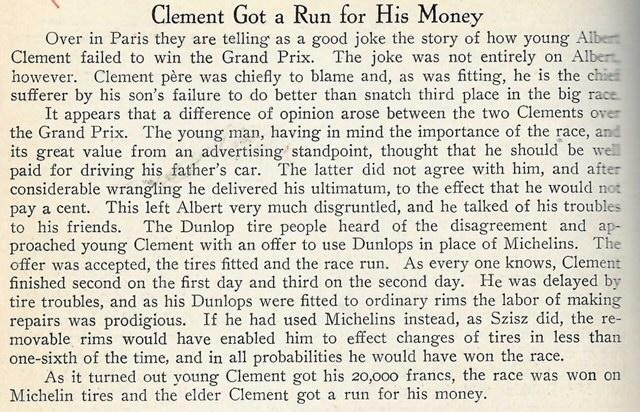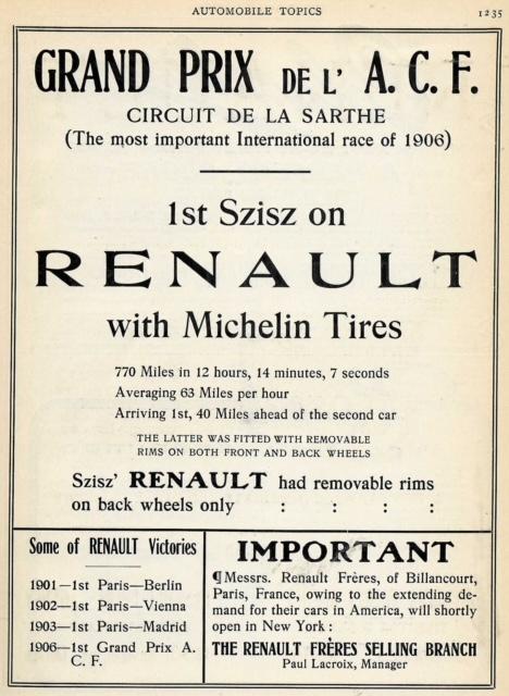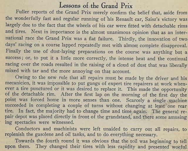 The French Grand Prix in 1905 was one of the first races bringing much interest in the removable rim with Ferenc Szisz winning on removable Michelins. More French races also further cemented their racing usefulness. "...it must be admitted that the old...style of non-removable rims is hopelessly archaic." "...[non-removable rims] will be, as extinct as the Dodo."