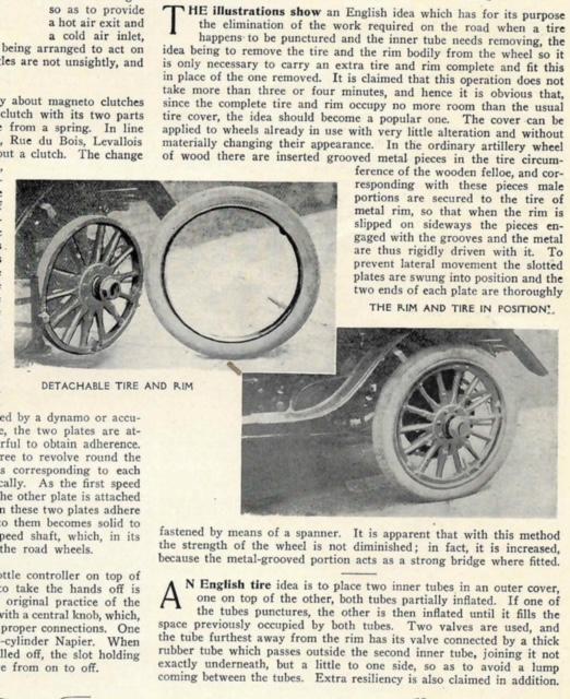 There were some minor mentions of the idea in 1904, but one of the earliest mentions could be found in The Motor in October 1905. Claiming to be an "English idea' that only took 'three of four minutes' and that 'the idea should become a popular one'. The 'idea' was simply to mount the inflated tube and tire on a metal ring that could be slid on to the perimeter of the wooden artillery style wheel and secured. This took the same amount of room as a regular spare tire and was a clever solution. A less ideal method of dealing with punctures mentioned at the bottom of the page was to place two semi-inflated tubes in the tire on top of each other so when the outside tube was punctured, the inner of the 2 tubes could be fully inflated to take up the space of the now deflated outer tube. I think we know now 115 years later which idea was the better of the two.