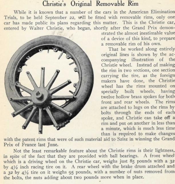 With the upcoming 1906 Vanderbilt Cup Races looming, the Americans did listen. Unique front-wheel drive innovator, Walter Christie of course needed to engineer his own style of removable rim which removed the spokes.
