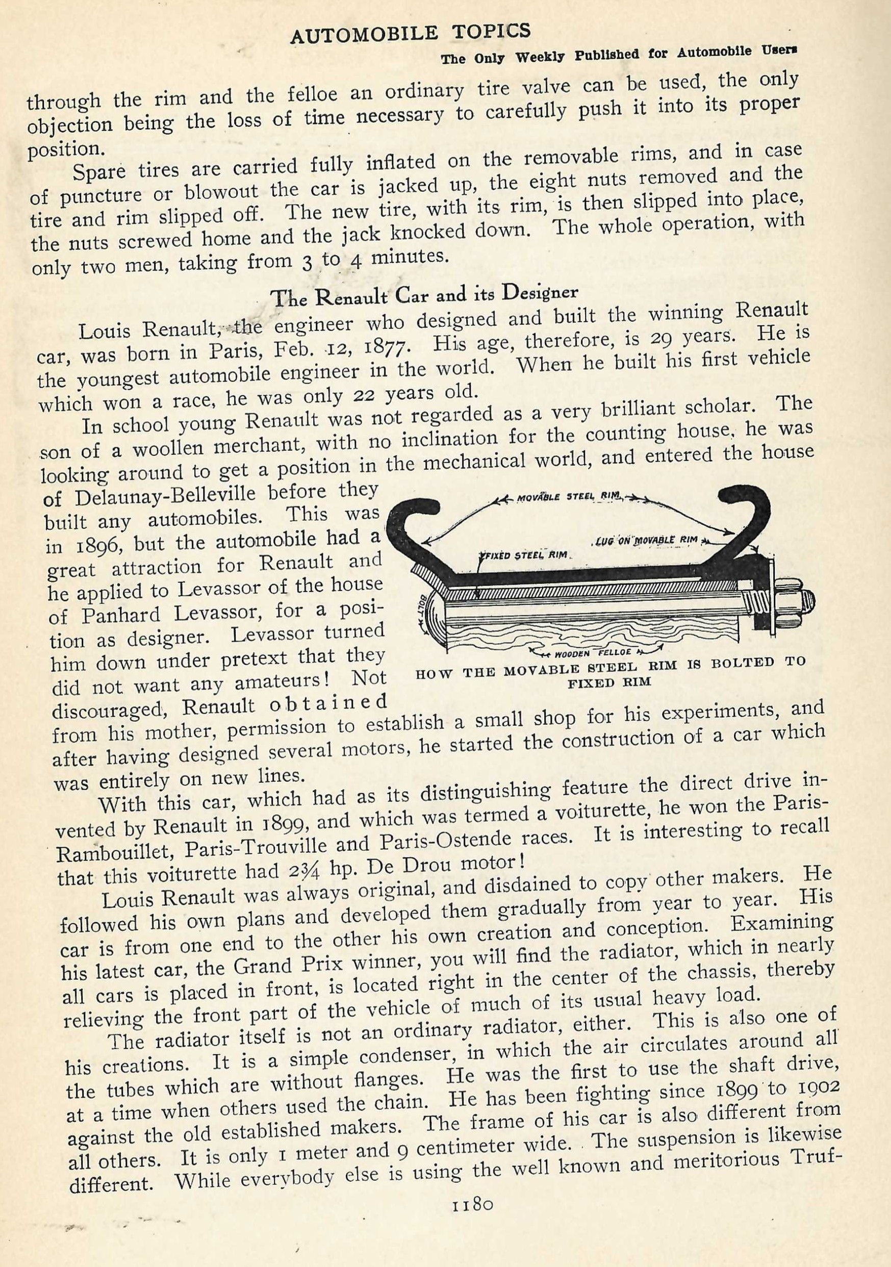 While touring cars would eventually benefit, race cars of the time were the first to see the advantage of removable rims. The necessity for being quick to change flat tires during a race often times can decide the outcome of a race even today. All following articles taken from Automobile Topics July-Oct 1906.