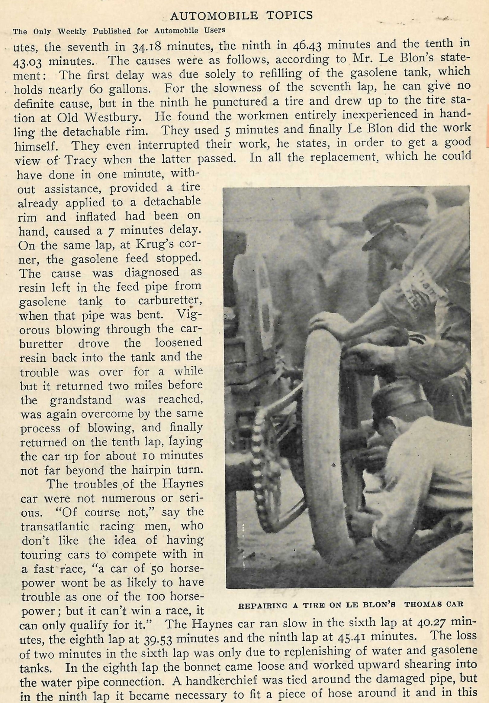 Surprisingly, during the 1906 American Elimination Trial, Hubert LeBlon experienced more time lost due to the removable rim. When he had a puncture, he found himself at the Old Westbury tire station with a tire crew unfamiliar with the removable rim. After 5 minutes, he ended up changing the tire himself.