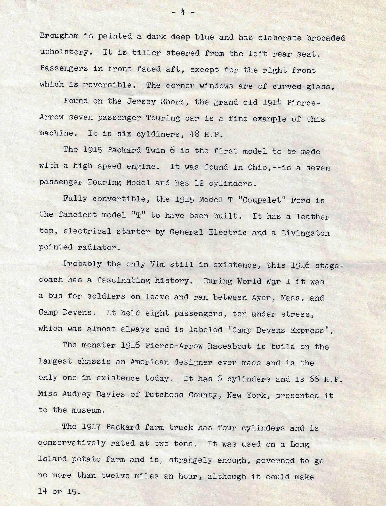 In the Auto Museum film, it shows Joe Tracy driving the Locomobile type I truck. This was made from a touring car by the Ardmore Garage in Ardmore, Pa. that was the Locomobile dealer there and used as a service truck for newer Locomobiles in the 1920s. I bought that truck/car from Austin and along with Walter McCarthy made new front fenders that were identical to the fenders it would have been fitted with when new in 1907, I also made a new dashboard and found an bought the proper brass headlamps and restored those as well. I sold the Locomobile before any further work was accomplished and it is my understanding that today the car is now fitted with a replica touring car body like it had when it was new.