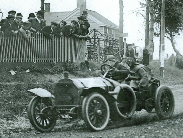 #1 Mercedes (Germany) driven by Albert Campbell, 60 HP. Finished 5th- Running in Hicksville when race was called. Averaged 35 mph. Referee William K. Vanderbilt, Jr. can be seen in the lower right corner wearing a fur coat.