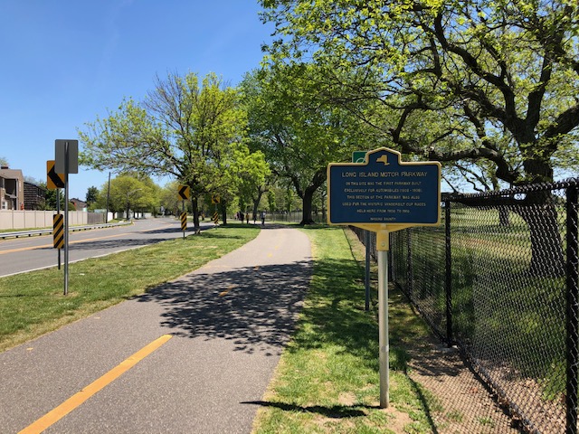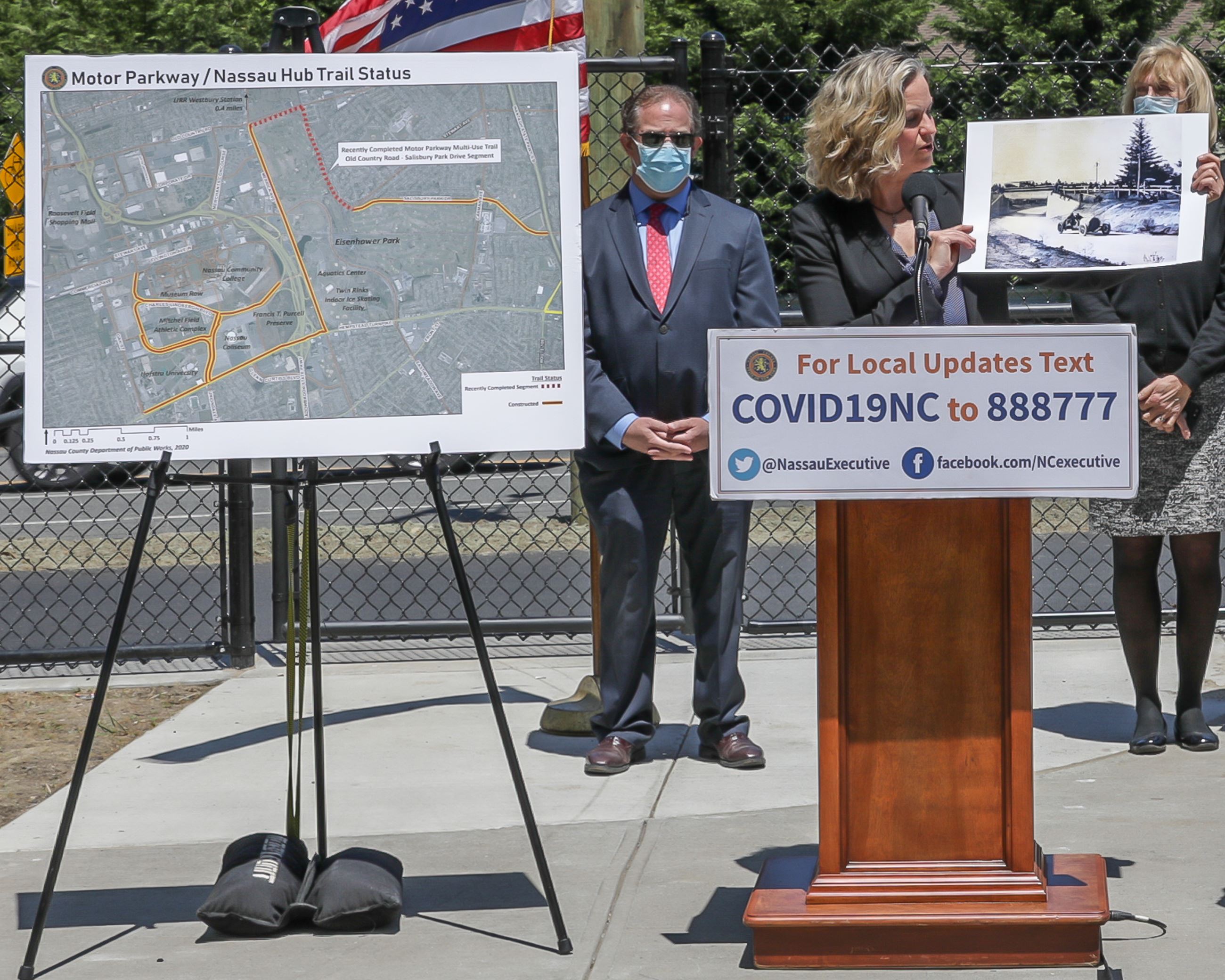 Last Friday, I was honored to participate at Nassau County Executive Laura Curran's COVID-19 press conference . County Executive Curran showcased the newly completed expansion of the Motor Parkway Trail, a multi-use trail that currently spans from Hofstra University to Eisenhower Park. The expansion was completed in time for National Bike Month, which runs through the month of May. Here County Executive Curran is holding up a photo of the Alco Black Beast during the 1909 Vanderbilt Cup Race at the exact spot of the press conference.
