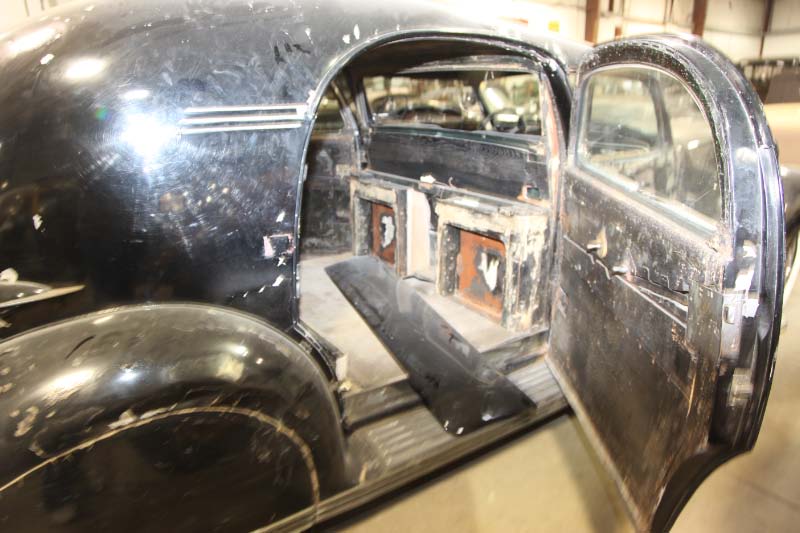 The first part of the restoration will be to remove the rear doors and repair the body structure and remount the doors so they open and close easily without sagging. To accomplish this the entire interior in the rear compartment has been removed , this includes upholstery, window moldings trim, vanities, decorative woodwork etc. This will allow room to get to the B pillars for repair, also access to the decorative speed streak trim at eye level on the exterior which are attached to the body by threaded rods with nuts.