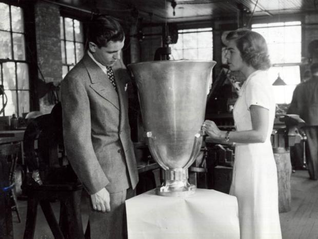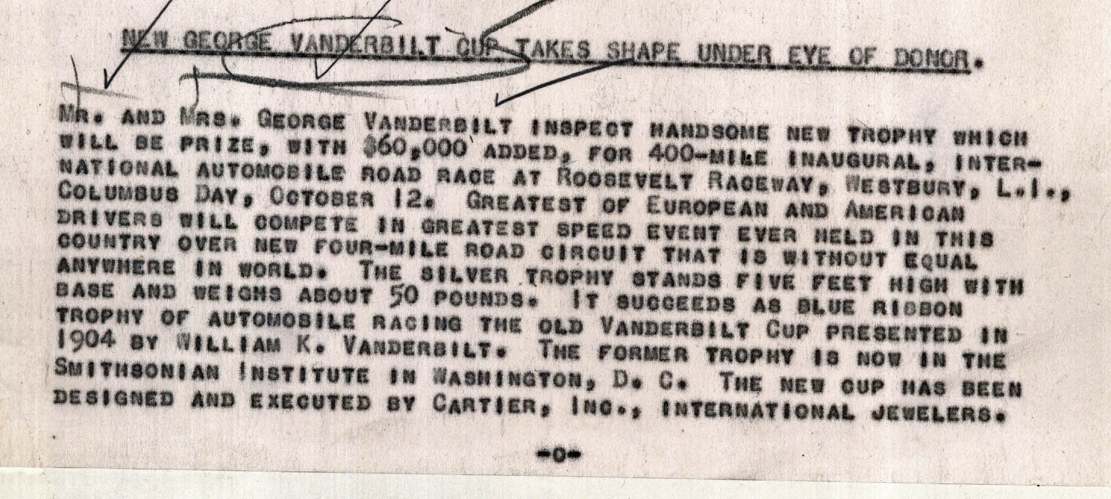 This press release showed George Vanderbilt and his wife examining the trophy for the 1936 Vanderbilt Cup Race at the Cartier factory.