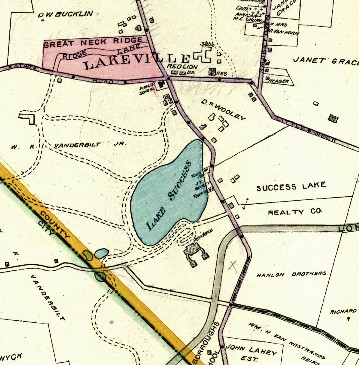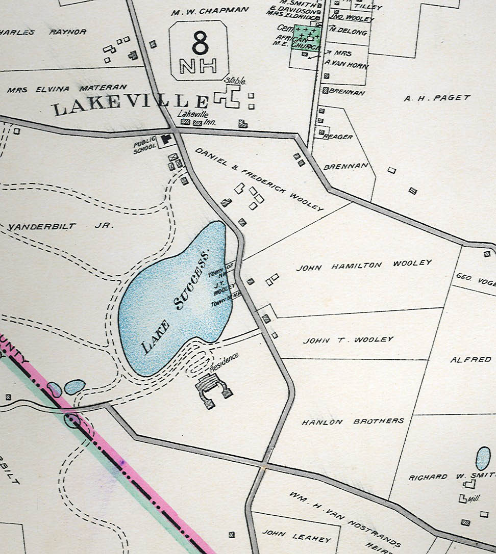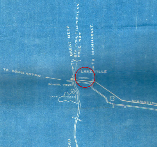 As seen in the 1906 Belcher-Hyde map, the Lakeville Hotel was on the north-east corner of the intersection of Lakeville Road and I. U. Willets Road in Lakeville, now Lake Success.