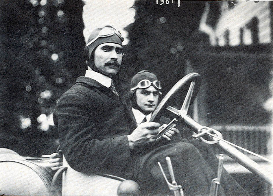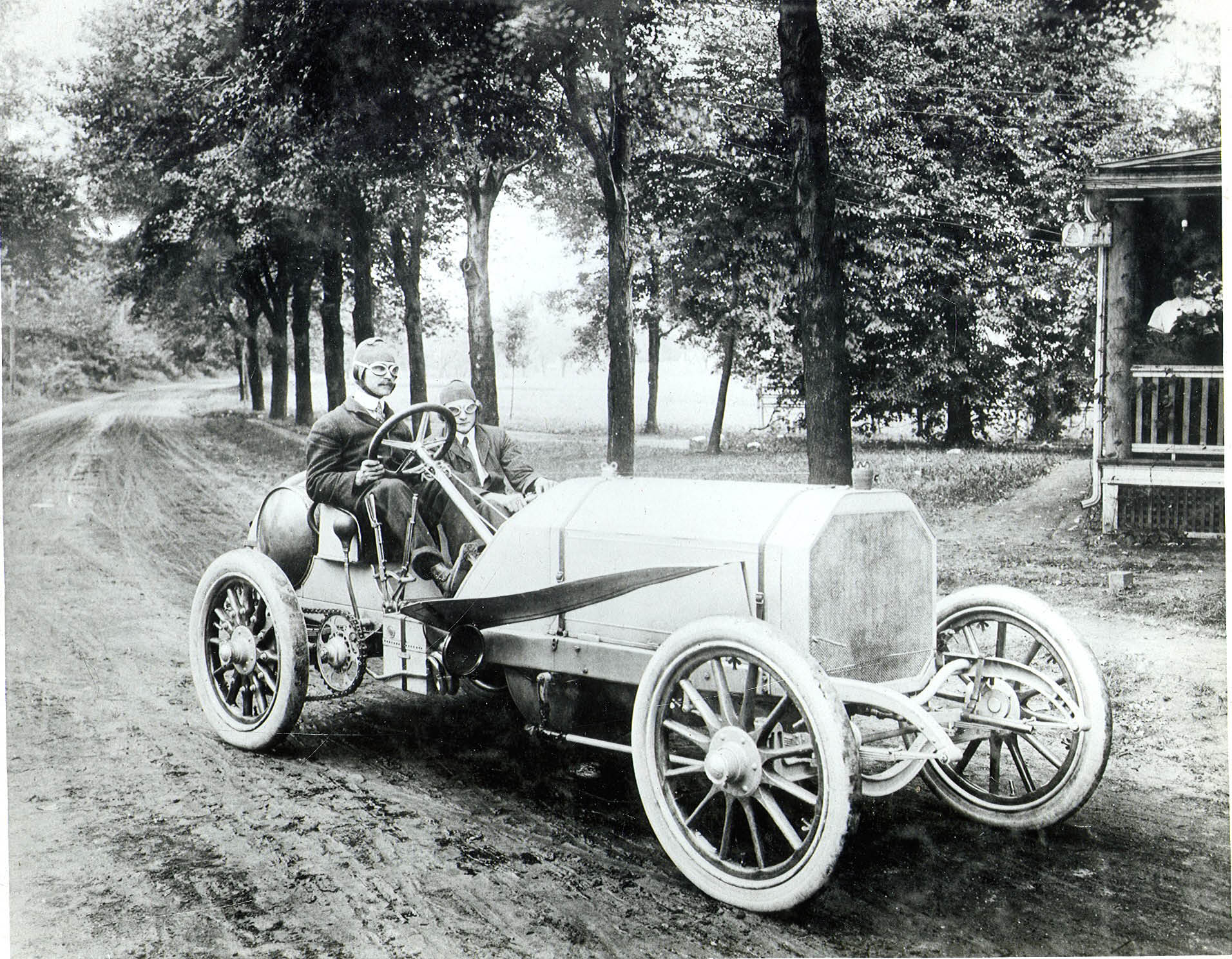 Driver Joe Tracy and his mechanician Al Poole in their Locomobile in front of the hotel.