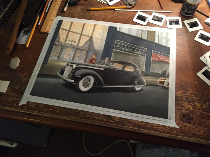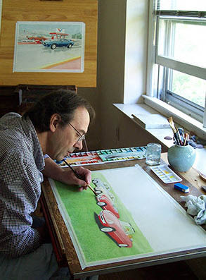 I begin each painting as any illustrator would: I project the selected slide onto the watercolor paper and carefully draw the car in pencil. It is impossible to draw a car accurately any other way, except perhaps by much drawing and erasure. This tends to destroy the paper’s ability to take the paint well, so in order to obtain a fine painting, drawing from the photo is indispensible.