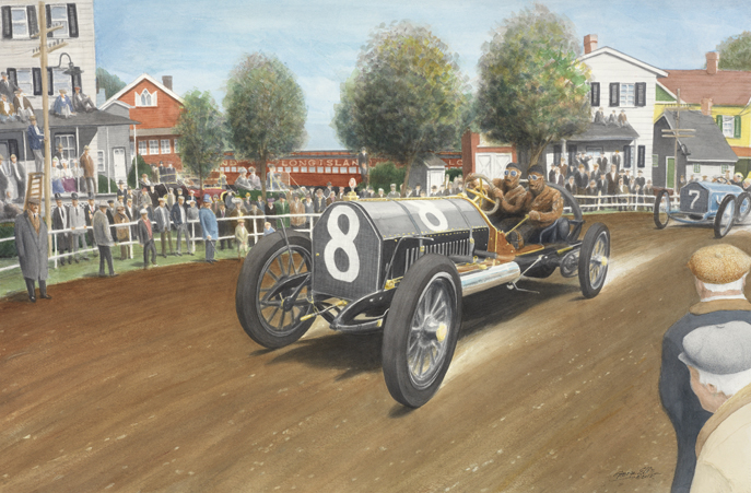 The original painting measures 12 by 16 inches; the prints are slightly smaller at 11 by 14 inches trim size. They are available ($95) through the George Ellis Gallery at www.georgeellis.com in the Special Topics Gallery, along with a painting of one of Howard’s other cars, the 1909 ALCO “Black Beast” racer, in a fanciful portrayal of the 1909 Vanderbilt Cup race. A print of this painting ($185) is also available at the Gallery, in a smaller limited edition of 25 prints measuring 14.75 by 20 inches.